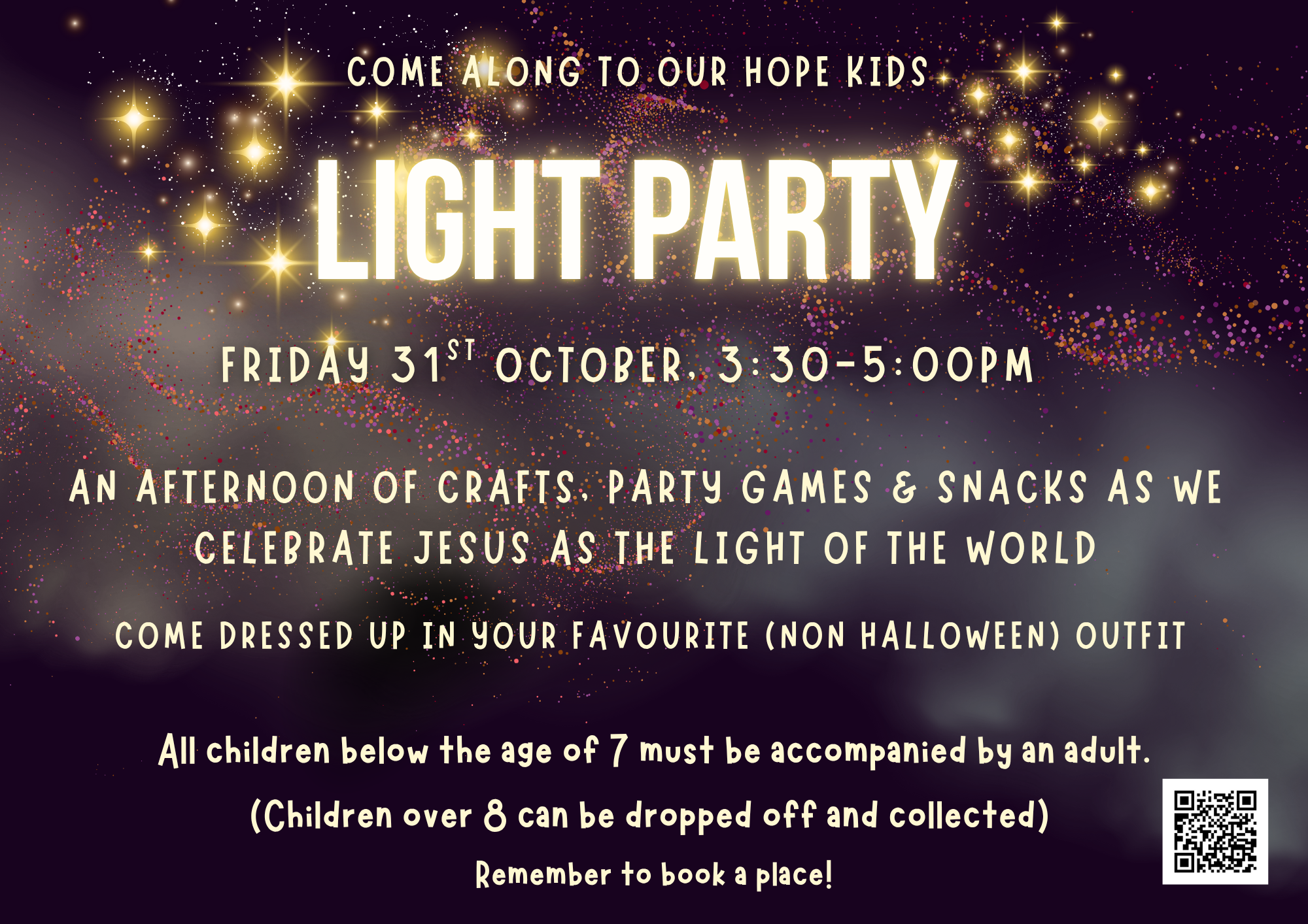 We are celebrating that Jesus is the light of the world. Come join us for games, crafts and fun! Please feel free to dress up as your favourite non scary characters.